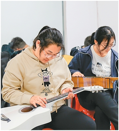 吉他班一共有十几名学员,年龄从18岁到40岁不等。有时指法弹错了,同学们也会相互提醒。大家畅所欲言,在欢声笑语中技艺逐渐精进。